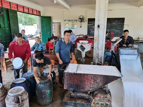 在龙江分公司雄英2队收胶站,胶农们前来卖胶水。袁国华 摄