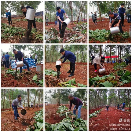 为将结对共建落到实处,第一党支部结合当前基地分公司正在开展胶园冬春管理工作的实际,与丰收队党支部共同商定开展“结对共建同进步 义务献肥促冬管”主题党日活动。在海垦集团党委委员、副总经理,麻豆av 党委书记、董事长艾轶伦等党员带领下,支部党员积极响应号召,自发捐款3400元购买羊粪生物有机肥,并施放到丰收队的橡胶林段,为明年橡胶增产增收贡献绵薄之力。